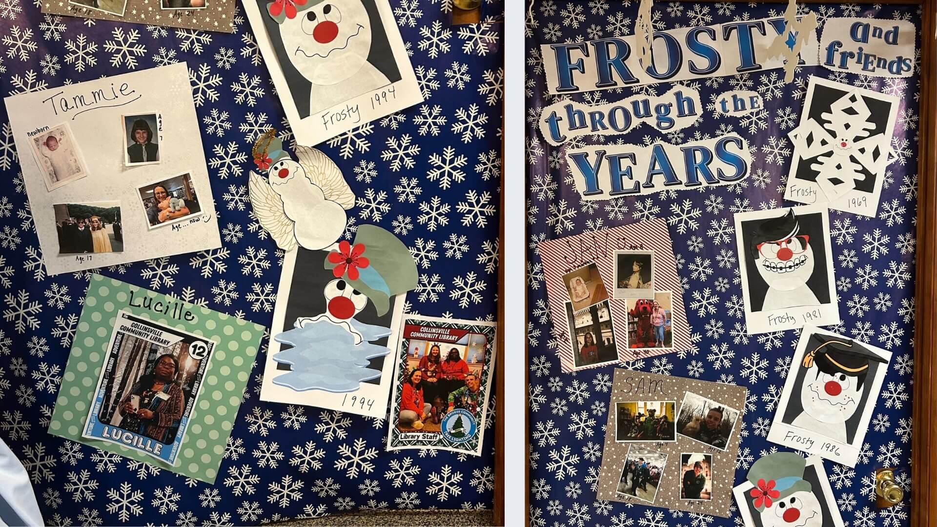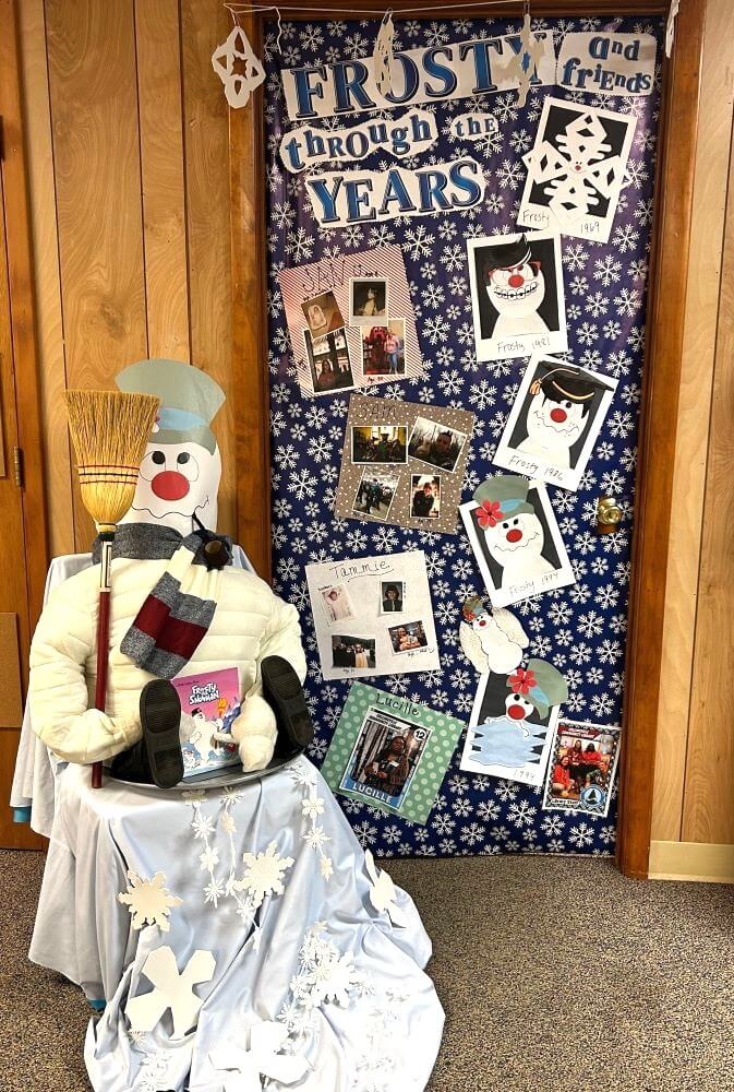 "Frosty and Friends through the Years" featuring library staff photographs and Frosty himself!