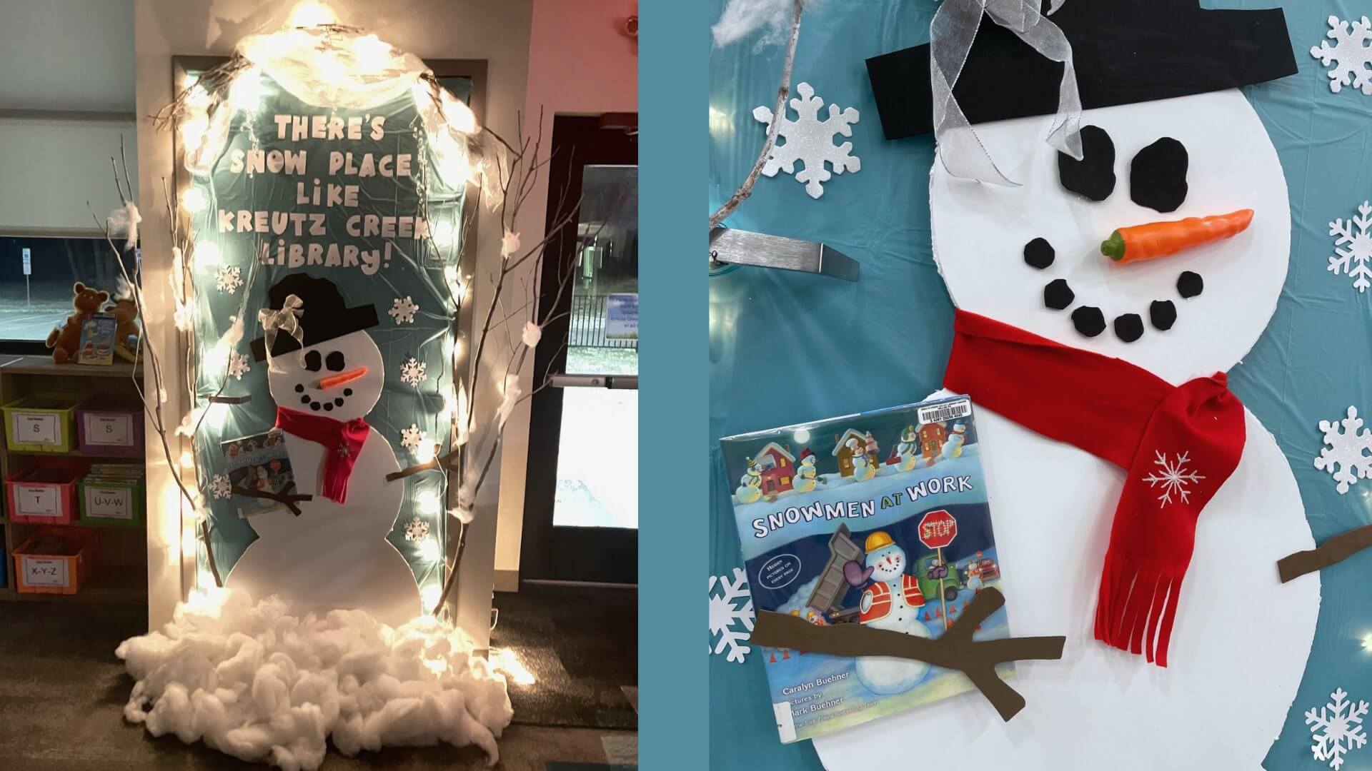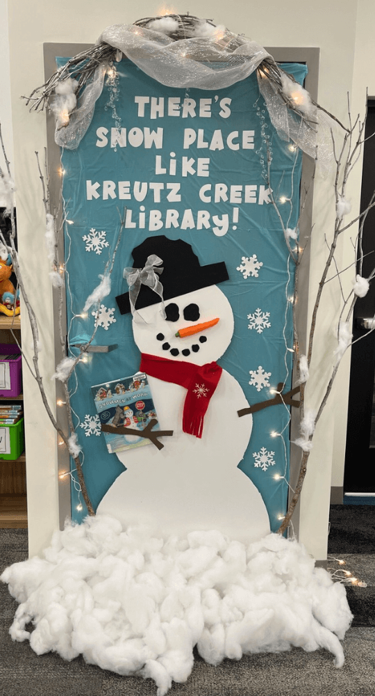 "There's Snow Place Like Kreutz Creek Library" featuring the book "Snowmen at Work," which is about different occupations that snowmen could have. This snowman is a librarian, of course!