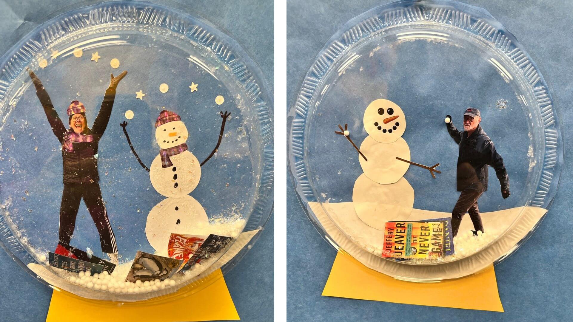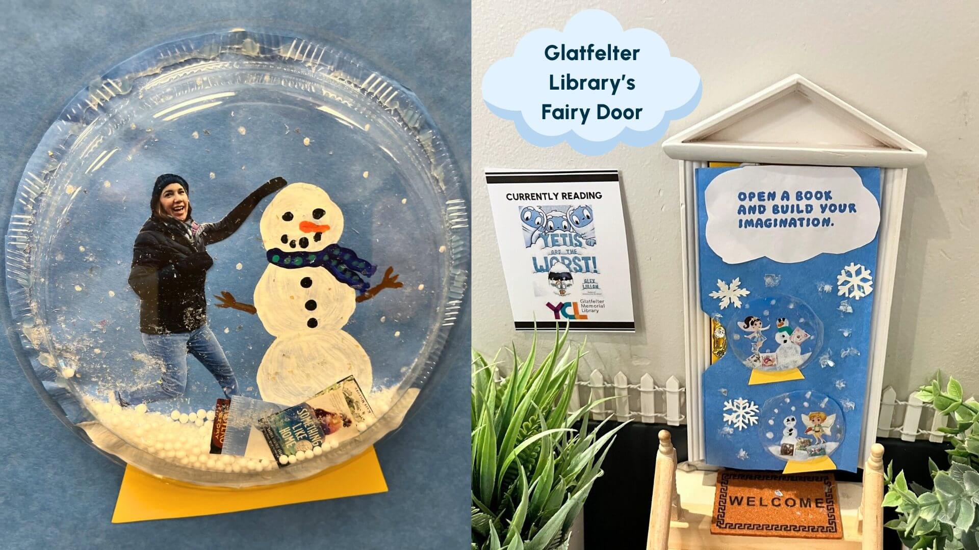"Open a Book and Build Your Imagination" featuring library staff in snow globes with some of their favorite books!