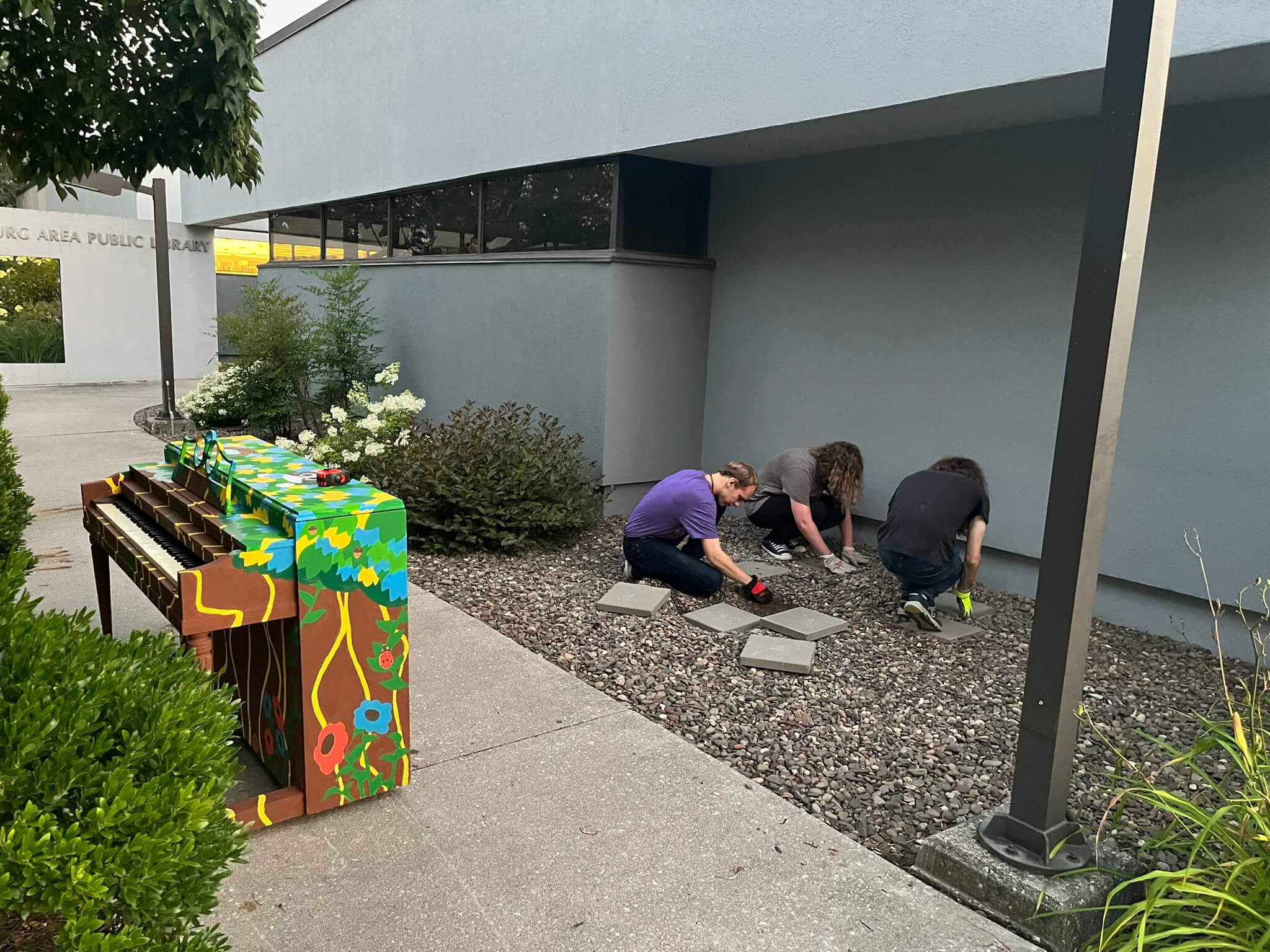 Preparing the installation site at the library. The piano is protected by the overhang of the building.